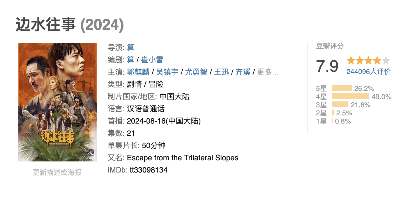 当今这部《边水旧事》的鸠合评分在7.9分,我以为这个分数低了,至少应该在8分以上!