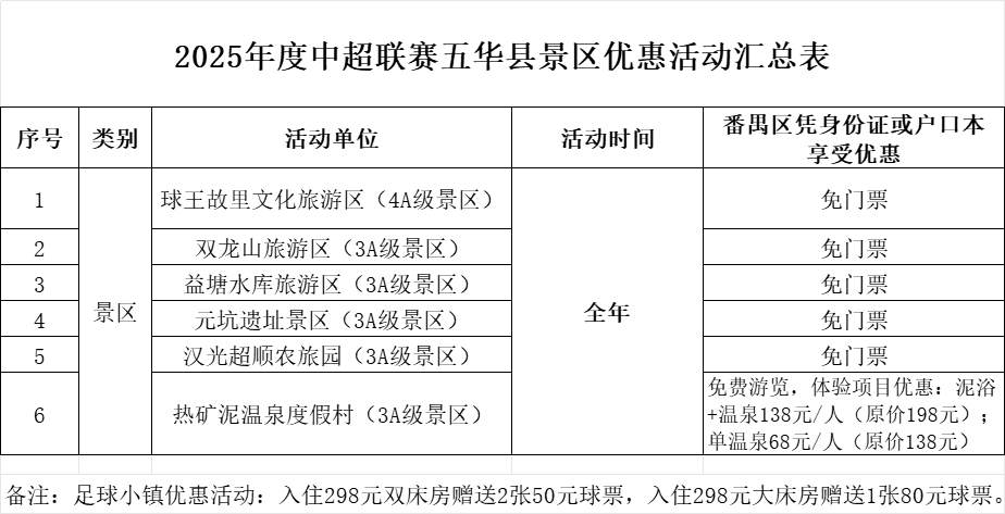 2025年全年,抓有番禺区身份证或户口本的住户,可免费游览五华球王故里文化旅游区(4A级景区)、双龙山旅游区(3A级景区)、益塘水库旅游区(3A级景区)、元坑古迹景区(3A级景区)以及汉光超顺农旅园(3A级景区)。无论是探寻球王故里的足球文化底蕴,已经踱步在双龙山的青山绿水间,又或是洗沐于益塘水库的宁静气象,番禺住户齐能免费开启这些精彩旅程。