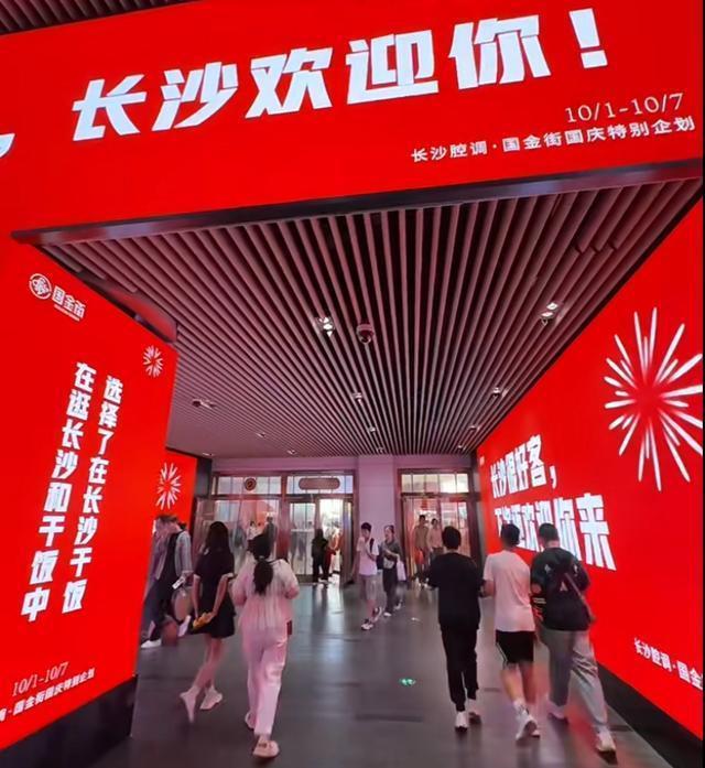 一位湖南网友记载下了我方搭乘地铁到国金街的场景,一下地铁就不错看到每个电子告白牌王人以艳红的配景写满了国庆道贺及对搭客的柔顺,“我在长沙,为新中国庆生”“我在长沙,满脑子王人是国庆节”“长沙接待你”“在逛长沙和干饭中,采用了在长沙干饭”。