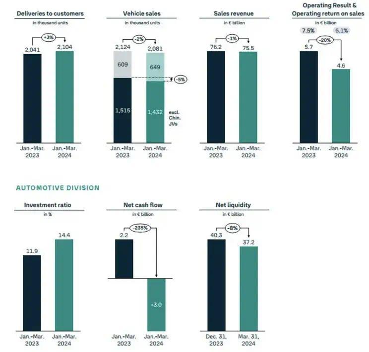 2024年第一季度的销售收入为75亿欧元,较旧年同期的762亿欧元有所下落。同期,买卖利润也从旧年同期的57.5亿欧元下落到46亿欧元,下落了约20%,买卖利润率也从旧年同期的7.5%下落到了6.1%。与此同期,中国商场的电动汽车销量却逆势增长了91%。这一销售事迹的挣扎衡导致了公司决定遴荐作为来改善全年的财务景象。