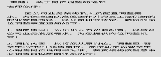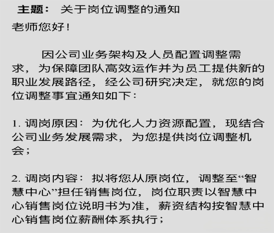 据上述邮件骨子,这次养息中,一部分新达内职工将被从原岗亭养息至“智谋中心”担任销售岗亭——销售平板或健康居品,岗亭职责以智谋中心销售岗亭评释书为准,薪资结构按智谋中心销售岗亭薪酬体系实验。
