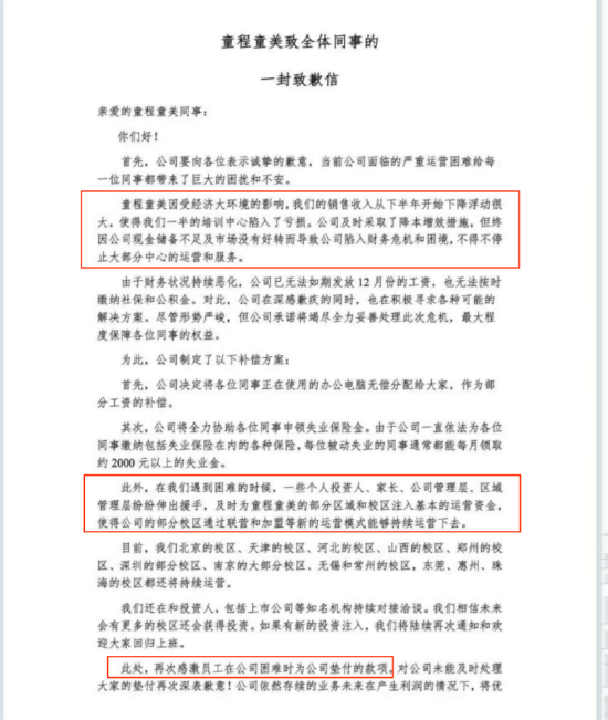 李腾提供的一份童程童好意思全员致歉信炫夸,在童程童好意思多地门店爆发“今夜跑路”情况前后,公司照实曾出现部分区域解决层及职工垫资的情况,这也意味着,一些门店对应的利润分拨将与垫资东谈主员的过问相匹配——部分门店被区域东谈主员成功盘下并非毫无依据。