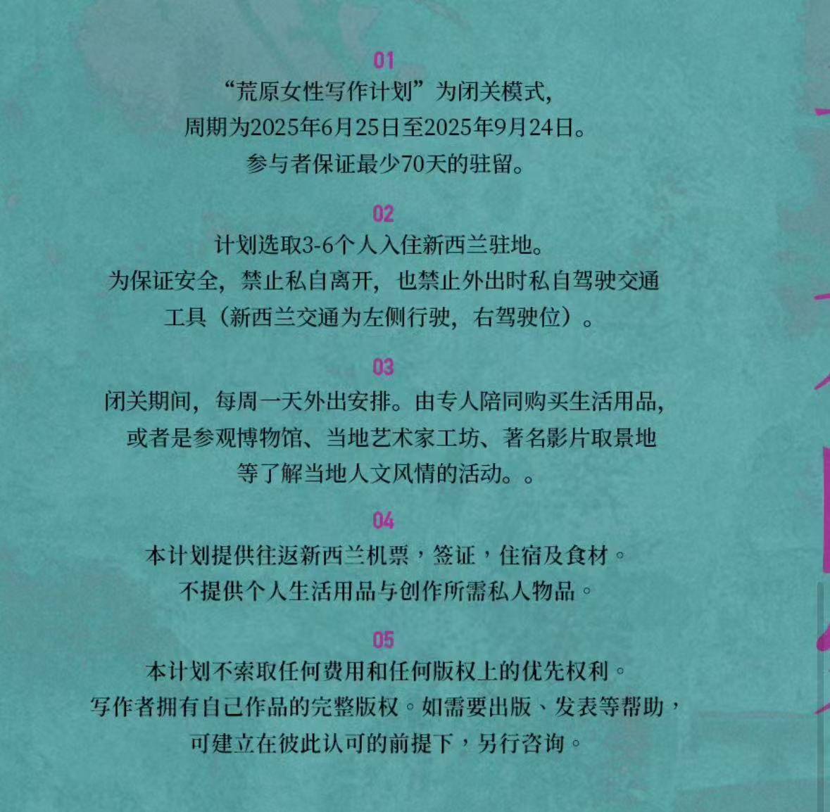 她在本年三月发起了“荒野女性写稿谋略”。这是一场为期三个月女性闭关写稿谋略,为女性提供一座位于新西兰的别墅看成写稿风光,导演本东谈主支付来去新西兰的机票签证餐食等用度,入选者则需要交5万东谈主民币的押金。