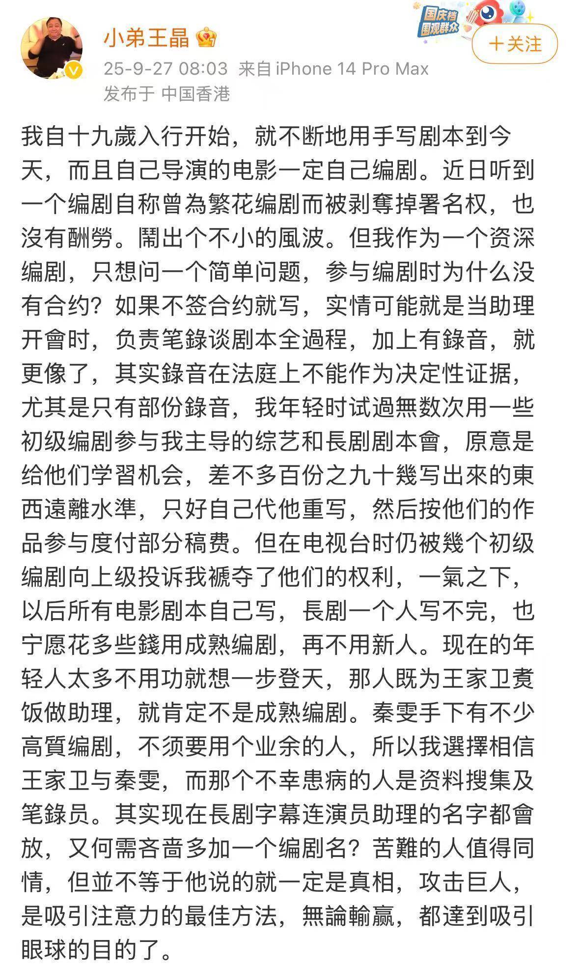 反倒是王晶、鲍德熹等有名业内东谈主士发文支撑王家卫——王晶默示我方肯定王家卫和秦雯,灌音在法庭上无法看成凭证;鲍德熹则默示是否有编剧签字需要看协议里规矩的职务。