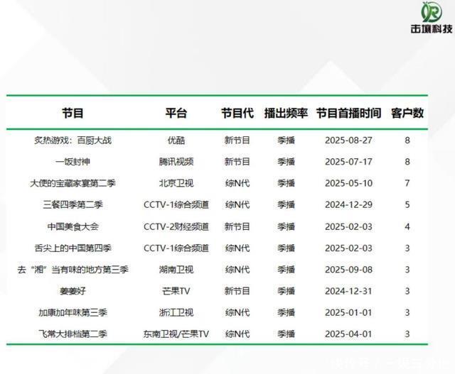从市集推崇看,好意思食竞技虽非全新品类,但胜在网综的新颖抒发,其网感化抒发得胜撬动了贸易价值。灯塔数据透露,《一饭封神》开播日正片市占率峰值达8.61%,《盛暑游戏:百厨大战》正片最高市占率达5.29%。更病笃的是,它考据了从线上内容到线下消耗的闭环才智:节目同款好意思食在好意思团团购的订单量周环比激增274%,并得胜与上海梅林、旺旺等品牌聚拢厨师开拓超50款联名居品。击壤科技数据透露:两档新综的客户数均达到8个,向上了《舌尖上的中国第4季》等综N代。