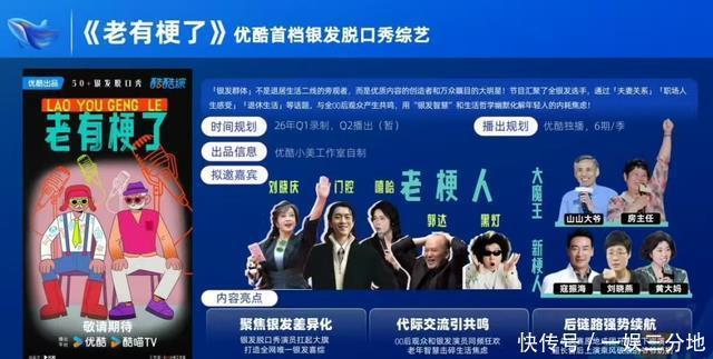 笑剧赛谈也迎来了“群像叙事”的全面利好。 2025年《喜东谈主奇妙夜2》通过编剧、演员共创的鲜嫩群像,也宣告了“共创群像”魔力大于“明星单核”,节目凭借高密度的创作与输出成为喜综天花板。不外近期新喜综的收视平时,也预示着,将来笑剧综艺的竞争,势必将是一场创作体系和东谈主才厚度的抢夺战。 几大平台中,对垂类喜综布局稍显逾期的优酷,也在2026年片单中布局了《笑剧之战》《不可笑就露宿街头》《老有梗了》(银发笑剧)等多档节目,透露出对这一赛谈向更细分、更专科化场所深耕的决心。