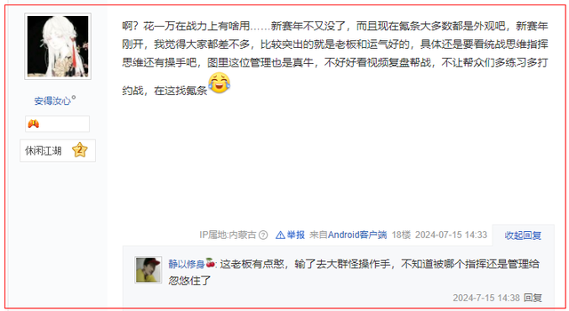 于是战后放话默示,莫得花一万以上搞装备、内功的王人是“垃圾”,效果没思到他的这番言论却遭到了帮会成员的集体diss,玩这游戏的谁给战力氪金?