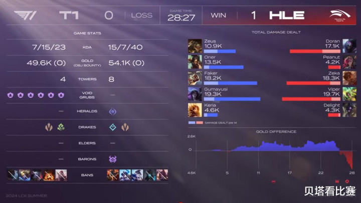 第一局T1上单鳄鱼,打豹女,中单飞机,下路卡莎加女坦;HLE上单贾克斯,打野蔚,中单岩雀,下路泽丽加毒头。4分钟oner豹女握上,Doran贾克斯借助驻守塔反杀Zeus鳄鱼,HLE拿下了一血。11分钟两边争夺巢虫打出1换1,不外T1拿下6巢虫。前期T1经济逾越1K。中期25分钟HLE拿下小龙,随后两边混战,Doran贾克斯猛如战神,HLE打出1换4后,拿劣等一条大龙。27分钟HLE捎带大龙buff从下路激动,Faker飞机当先被秒,Doran贾克斯绕后包夹,HLE团灭T1后,拿劣等一局的见效。首局两边输出如下,Viper泽丽打出全场最高伤害,T1这边伤害最高的是gumayusi卡莎。