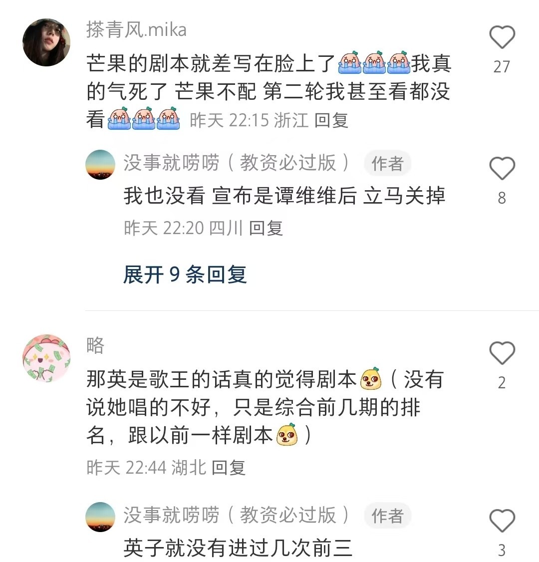 芒果台脚本操作看似有了一个圆满的效果,“五旬老太”最终收效而归,其他选手再雄壮也要被击败。但是赢了脚本,失了东谈主心,以后谁还对芒果台的节目抱有一点信任和期待呢?