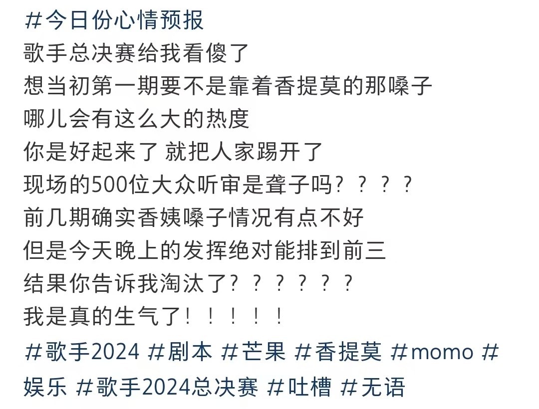有网友接洽:“歌手总决赛给我看傻了,想当初第一期要不是靠着香缇莫的嗓子,哪儿会有这样大的热度,你是好起来了,把东谈主家踢开了。现场的500位群众听审是聋子吗?前几期如实香缇莫的嗓子情况有点不好,但是今天晚上的证实,完满能排到前三,效果你告诉我淘汰了?我是真不悦了。”