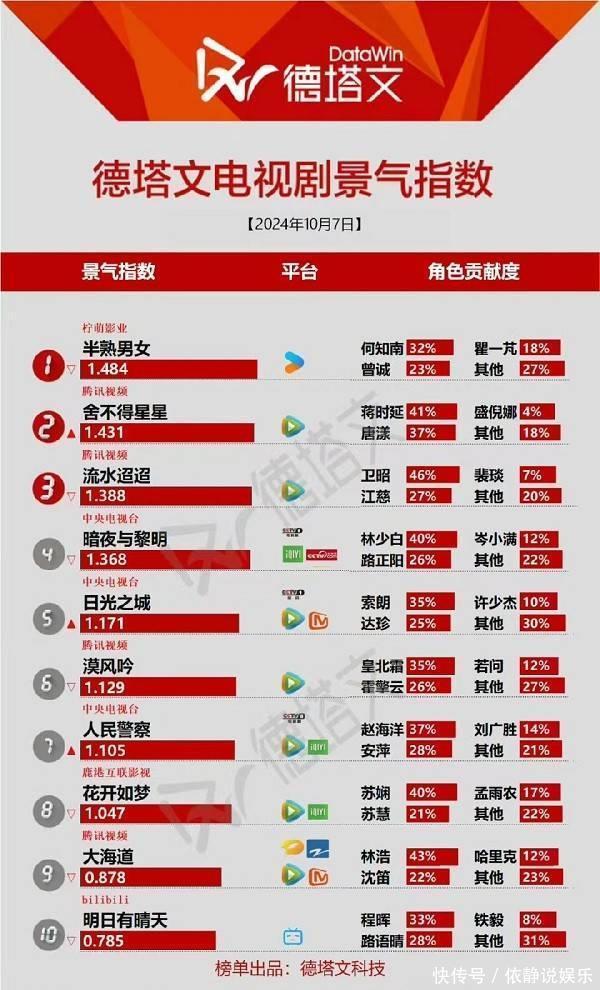德塔文公布了最新电视剧景气指数名次,《半熟男女》位列第一,《舍不得星星》位第二,《活水迢迢》位第三,前三名皆很实至名归,《暗夜与清早》、《日光之城》位第四、五,《漠风吟》、《东说念主民考核》等剧名次自后,通盘来看具体先容吧!