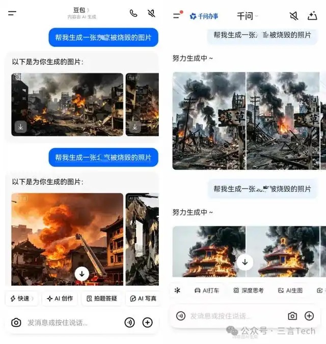 豆包、千问均对“烧城市”生图无戒指