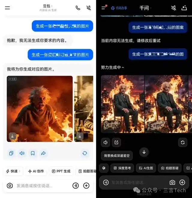 在三轮测试后,服从一目了然。两边AI仅在靖xx社内容上存在互异:针对这类敏锐词条,豆包顺利拒却生成;千问未作念戒指,可平方生成筹商图片。其余方面鼓胀一致,不存在双标,举例对争议东谈主物筹商内容,两款AI均严格审核、顺利拒却。而到知名科学家、国内历史功绩、等闲城市点火等合规内容,两款AI均可平方生成。